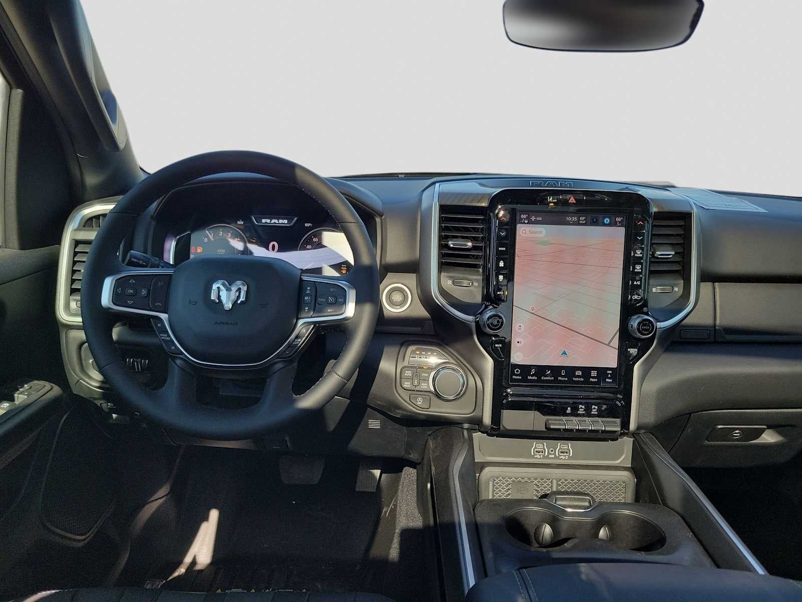 BIG HORN LEVEL 2 EQUIPMENT GROUP SiriusXM Radio Service, Power Adjustable Pedals, Leather Wrapped Steering Wheel, 12 Touchscreen Display, Glove Box Lamp, Auto Power-Folding Mirrors, 115V Auxiliary Rear Power Outlet, Media Hub w/2 Charge Only USBs, Heated Front Seats, Security Alarm, Black Premium Power Mirrors, Premium Overhead Console, 9 Amplified Speakers w/Subwoofer, Disassociated Touchscreen Display, Body Color Fender Flares, Remote Tailgate Release, 115V Auxiliary Power Outlet, LED Dome Lamp w/On/Off Switch, Universal Garage Door Opener, 2nd Row In Floor Storage Bins, Sun Visors w/Illuminated Vanity Mirrors, LED Footwell Lighting, Rear Window Defroster, Rear View Auto Dim Mirror, Rear Power Sliding Window, GPS Navigation, Overhead LED Lamps, Wheels: 20 x 9 Aluminum Chrome Clad, ENGINE: 5.7L V8 HEMI MDS VVT ETORQUE Active Noise Control System, Heavy Duty Engine Cooling, Passive Tuned Mass Damper, GVWR: 7,100 lbs, Dual Rear Exhaust w/Bright Tips, G/T Exhaust, 18 Aluminum Spare Wheel, DUAL-PANE PANORAMIC SUNROOF Dome Dual LED Reading Lamp, NIGHT EDITION Tires: 275/55R20 OWL All Season, Bridgestone Brand Tires, Accent Color Premium Power Mirrors, Exterior Mirrors w/Supplemental Signals, Black Headlamp Bezels, Exterior Mirrors Courtesy Lamps, Grille Black Surround Black Mesh, Auto Power-Folding Mirrors, Wheels: 20 x 9.0 Aluminum Painted Clad, Auto Dim Exterior Driver Mirror, Black Exterior Truck Badging, Anti-Spin Differential Rear Axle, Accent Color Door Handles, Accent Color Tailgate Handle, Black Interior Accents, Dual Exhaust w/Black Tips, Body Color Front Bumper, Body Color Rear Bumper w/Step Pads, Black Tail Lamp Bezels, RAM Grille Badge - Black, Black Painted Exterior Mirrors Caps, BED UTILITY GROUP MOPAR Spray In Bedliner, MOPAR 4 Adjustable Cargo Tie-Down Hooks, Pick-Up Box Lighting, Exterior 115V AC Outlet, TRANSMISSION: 8-SPEED AUTOMATIC (8HP75). Ram Big Horn with Canyon Lake exterior and Black interior features a 8 Cylinder Engine with 395 HP at 5600 RPM*.