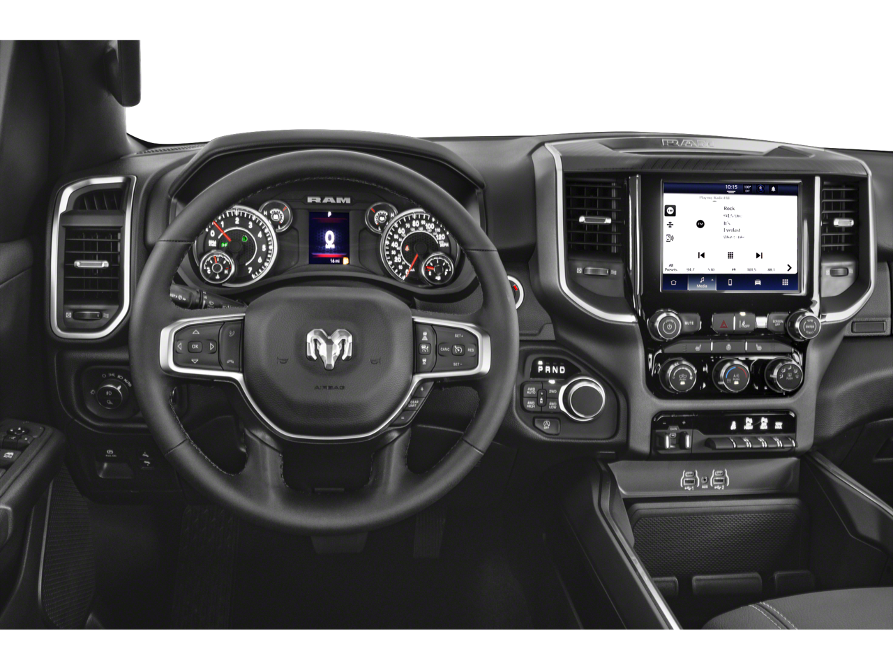 BIG HORN LEVEL 2 EQUIPMENT GROUP SiriusXM Radio Service, Power Adjustable Pedals, Leather Wrapped Steering Wheel, 12 Touchscreen Display, Glove Box Lamp, Auto Power-Folding Mirrors, 115V Auxiliary Rear Power Outlet, Media Hub w/2 Charge Only USBs, Heated Front Seats, Security Alarm, Black Premium Power Mirrors, Premium Overhead Console, 9 Amplified Speakers w/Subwoofer, Disassociated Touchscreen Display, Body Color Fender Flares, Remote Tailgate Release, 115V Auxiliary Power Outlet, LED Dome Lamp w/On/Off Switch, Universal Garage Door Opener, 2nd Row In Floor Storage Bins, Sun Visors w/Illuminated Vanity Mirrors, LED Footwell Lighting, Rear Window Defroster, Rear View Auto Dim Mirror, Rear Power Sliding Window, GPS Navigation, Overhead LED Lamps, Wheels: 20 x 9 Aluminum Chrome Clad, ENGINE: 3.0L I6 HURRICANE SO TWIN TURBO ESS Aux Battery, 700 Amp Maintenance Free Battery, Active Noise Control System, GVWR: 7,100 lbs, 3.55 Rear Axle Ratio, Dual Rear Exhaust w/Bright Tips, Start-Stop Dual Battery System, 230 Amp Alternator, NIGHT EDITION Tires: 275/55R20 OWL All Season, Bridgestone Brand Tires, Accent Color Premium Power Mirrors, Exterior Mirrors w/Supplemental Signals, Black Headlamp Bezels, Exterior Mirrors Courtesy Lamps, Grille Black Surround Black Mesh, Auto Power-Folding Mirrors, Wheels: 20 x 9.0 Aluminum Painted Clad, Auto Dim Exterior Driver Mirror, Black Exterior Truck Badging, Anti-Spin Differential Rear Axle, Accent Color Door Handles, Accent Color Tailgate Handle, Black Interior Accents, Dual Exhaust w/Black Tips, Body Color Front Bumper, Body Color Rear Bumper w/Step Pads, Black Tail Lamp Bezels, RAM Grille Badge - Black, Black Painted Exterior Mirrors Caps, MOPAR FRONT & REAR RUBBER FLOOR MATS, TRANSMISSION: 8-SPEED AUTOMATIC (8HP75). Ram Big Horn with Bright White Clearcoat exterior and Black interior features a Straight 6 Cylinder Engine with 305 HP at 6400 RPM*.