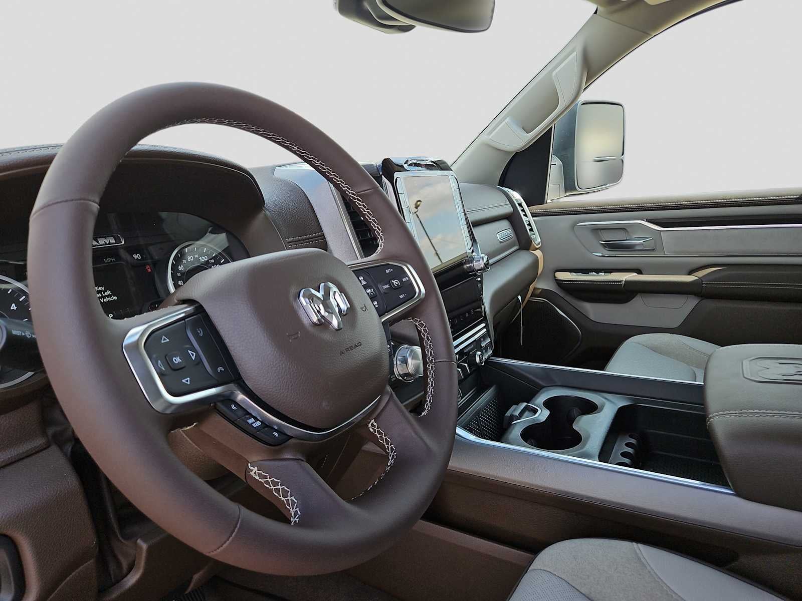 LARAMIE SOUTHWEST EDITION Accent Color Premium Power Mirrors, Power Deployable Running Boards, Grille Surround 3 Body Color Tex 4 Chrome, Trailer Brake Control, Tow Hooks, MOPAR Lockable Console Storage, Body Color Front Bumper, Dual-Pane Panoramic Sunroof, LED Dome/Reading Lamp, Dome Dual LED Reading Lamp, Body Color Rear Bumper w/Step Pads, Black Painted Exterior Mirrors Caps, WHEELS: 22 X 9 FORGED ALUMINUM Tires: 285/45R22XL BSW All Season, Pirelli Brand Tires, BED UTILITY GROUP MOPAR Spray In Bedliner, MOPAR 4 Adjustable Cargo Tie-Down Hooks, Exterior 115V AC Outlet, ANTI-SPIN DIFFERENTIAL REAR AXLE, LARAMIE LEVEL 1 EQUIPMENT GROUP Remote Tailgate Release, Rain Sensitive Windshield Wipers, MOPAR FRONT & REAR RUBBER FLOOR MATS, TRANSMISSION: 8-SPEED AUTOMATIC (8HP75) (STD), ENGINE: 3.0L I6 HURRICANE SO TWIN TURBO ESS (STD). Ram Laramie with Forged Blue Metallic exterior and Sea Salt/Bison Brown interior features a Straight 6 Cylinder Engine with 420 HP at 5200 RPM*.
