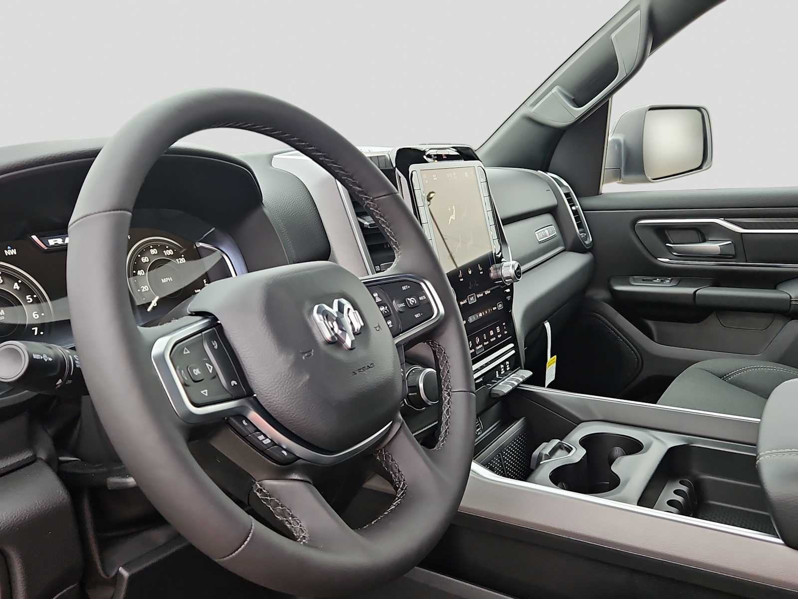 BIG HORN LEVEL 2 EQUIPMENT GROUP SiriusXM Radio Service, Power Adjustable Pedals, Leather Wrapped Steering Wheel, 12 Touchscreen Display, Glove Box Lamp, Auto Power-Folding Mirrors, 115V Auxiliary Rear Power Outlet, Media Hub w/2 Charge Only USBs, Heated Front Seats, Security Alarm, Black Premium Power Mirrors, Premium Overhead Console, 9 Amplified Speakers w/Subwoofer, Disassociated Touchscreen Display, Body Color Fender Flares, Remote Tailgate Release, 115V Auxiliary Power Outlet, LED Dome Lamp w/On/Off Switch, Universal Garage Door Opener, 2nd Row In Floor Storage Bins, Sun Visors w/Illuminated Vanity Mirrors, LED Footwell Lighting, Rear Window Defroster, Rear View Auto Dim Mirror, Rear Power Sliding Window, GPS Navigation, Overhead LED Lamps, Wheels: 20 x 9 Aluminum Chrome Clad, ENGINE: 5.7L V8 HEMI MDS VVT ETORQUE Active Noise Control System, Heavy Duty Engine Cooling, Passive Tuned Mass Damper, GVWR: 7,100 lbs, Dual Rear Exhaust w/Bright Tips, G/T Exhaust, 18 Aluminum Spare Wheel, NIGHT EDITION Tires: 275/55R20 OWL All Season, Bridgestone Brand Tires, Accent Color Premium Power Mirrors, Exterior Mirrors w/Supplemental Signals, Black Headlamp Bezels, Exterior Mirrors Courtesy Lamps, Grille Black Surround Black Mesh, Auto Power-Folding Mirrors, Wheels: 20 x 9.0 Aluminum Painted Clad, Auto Dim Exterior Driver Mirror, Black Exterior Truck Badging, Anti-Spin Differential Rear Axle, Accent Color Door Handles, Accent Color Tailgate Handle, Black Interior Accents, Dual Exhaust w/Black Tips, Body Color Front Bumper, Body Color Rear Bumper w/Step Pads, Black Tail Lamp Bezels, RAM Grille Badge - Black, Black Painted Exterior Mirrors Caps, MOPAR FRONT & REAR RUBBER FLOOR MATS, TRANSMISSION: 8-SPEED AUTOMATIC (8HP75). Ram Lone Star with Bright White Clearcoat exterior and Black interior features a 8 Cylinder Engine with 395 HP at 5600 RPM*.