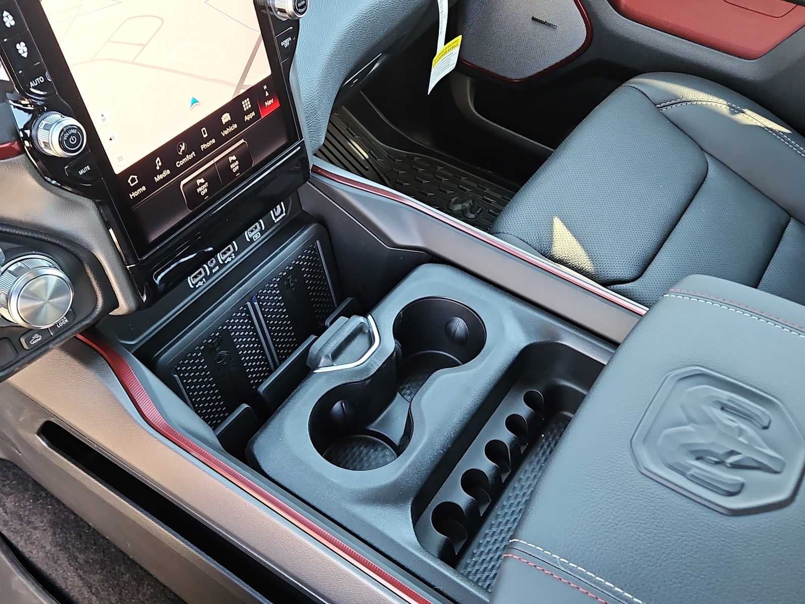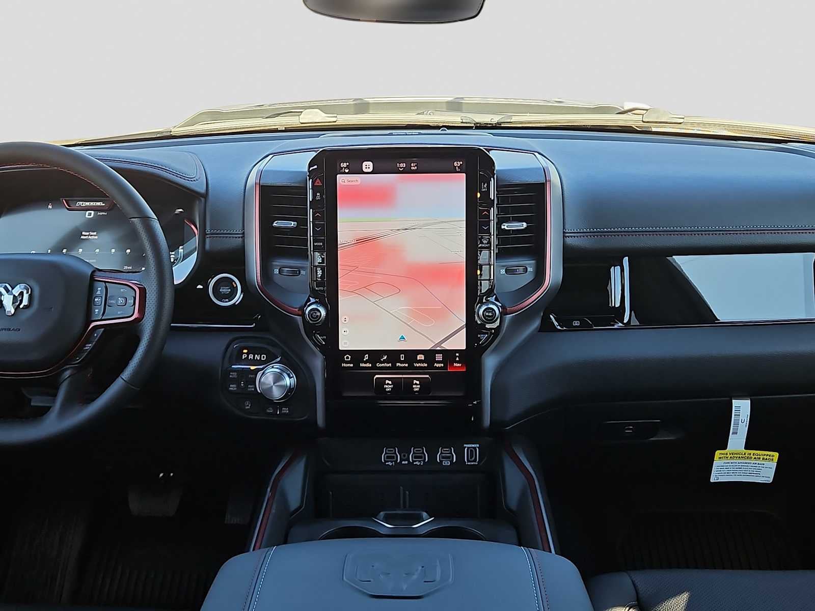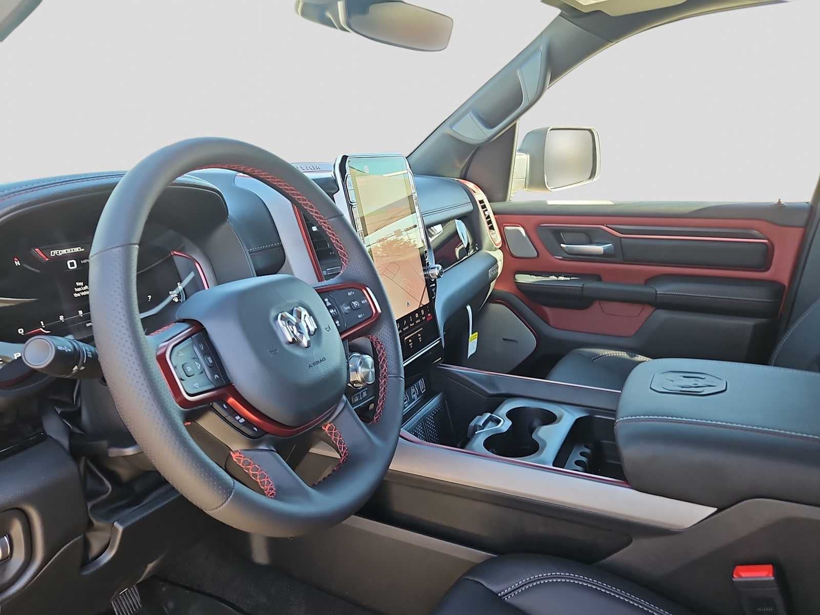 REBEL LEVEL 2 EQUIPMENT GROUP Power Adjustable Pedals w/Memory, Front Passenger Interactive Display, Power 2-Way Passenger Lumbar Adjust, Auto Power-Folding Mirrors, 115V Auxiliary Rear Power Outlet, Media Hub w/2 Charge Only USBs, Proximity Approach/Departure Lamps, Power Adjust 8-Way Front Passenger Seat, Security Alarm, Dual Wireless Charging Pad, harman/kardon® 19 Speaker Premium Sound, Rear Window Defroster, Rain Sensitive Windshield Wipers, Auto Dim Exterior Driver Mirror, Accent Color Door Handles, Heated Second Row Seats, Black Painted Exterior Mirrors Caps, Exterior Mirrors Approach Lamps, Smartphone As A Key Capable, 14.4 Touchscreen Display, Accent Color Premium Power Mirrors, Exterior Mirrors w/Supplemental Signals, Exterior Mirrors Courtesy Lamps, Radio: Uconnect 5 Nav w/14.4, RED/BLACK, LUX LEATHER TRIMMED BUCKET SEATS Power 2-Way Passenger Lumbar Adjust, Ventilated Front Seats, Power Adjust 8-Way Front Passenger Seat, TRANSMISSION: 8-SPEED AUTOMATIC (8HP75) (STD), ENGINE: 3.0L I6 HURRICANE SO TWIN TURBO ESS (STD). Ram Rebel with Canyon Lake exterior and Red/Black interior features a Straight 6 Cylinder Engine with 420 HP at 5200 RPM*.