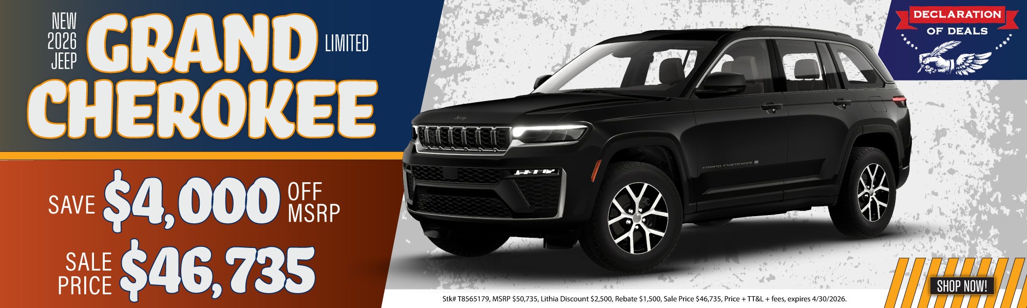 Stk# T8565179, MSRP $50,735, Lithia Discount $2,500, Rebate $1,500, Sale Price $43,735, Price + TT&L + fees, ends 4/30/26.