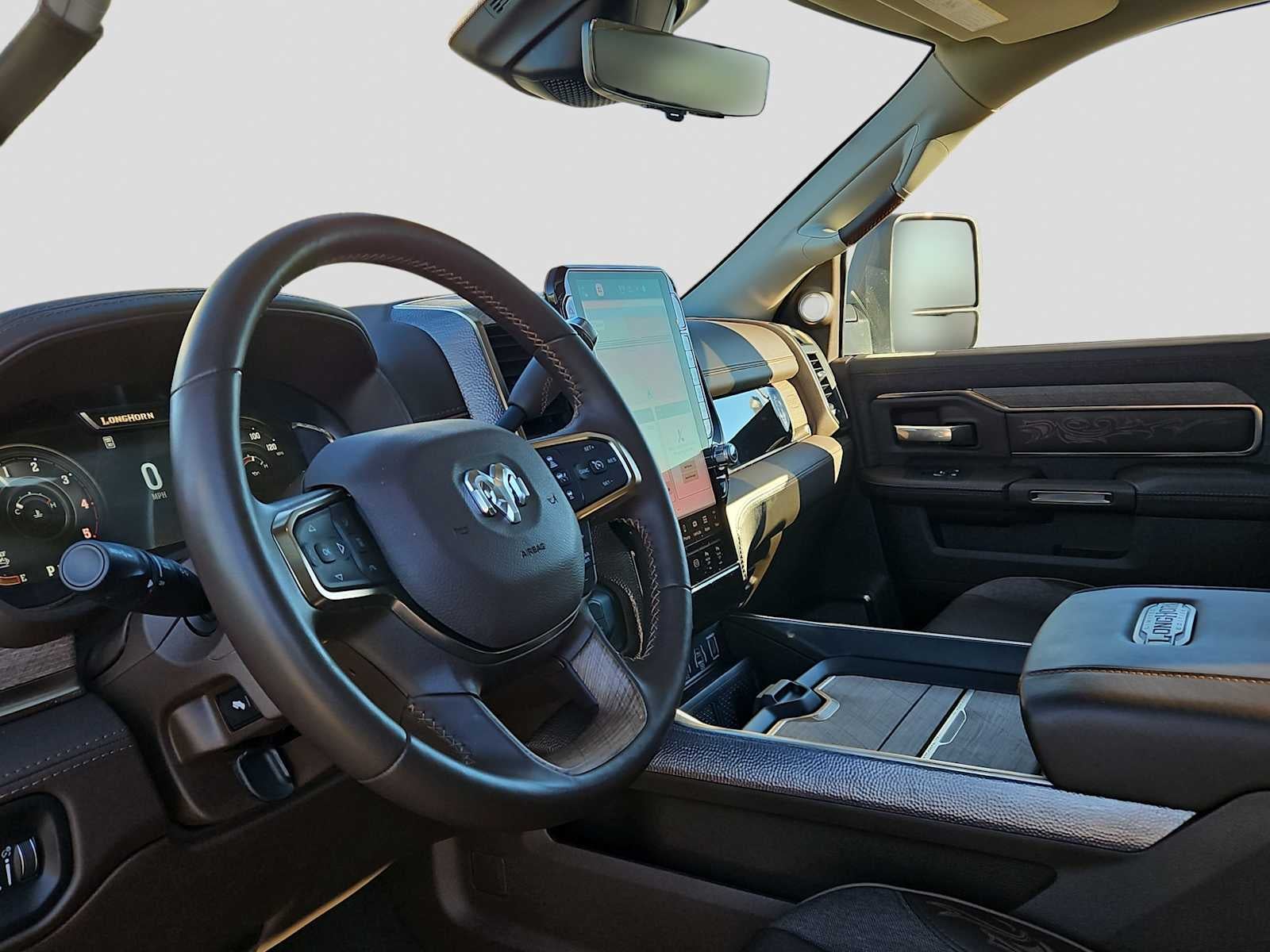 LONGHORN LEVEL 1 EQUIPMENT GROUP MOPAR Spray In Bedliner, Center Stop Lamp w/Cargo View Camera, Anti-Spin Differential Rear Axle, Surround View Camera System, Safety Group, Active Lane Management System, Traffic Sign Recognition, Drowsy Driver Detection, Adaptive Steering System, Power Deployable Running Boards, Trailer Tire Pressure Monitoring System, Trailer Reverse Guidance, Digital Rearview Mirror, POWER SUNROOF, TRANSMISSION: 8-SPEED TORQUEFLITE HD AUTOMATIC (STD), ENGINE: 6.7L I6 CUMMINS HO TURBO DIESEL GVWR: 11,040 lbs (STD). Ram Longhorn with Bright White Clearcoat exterior and Bison Brown interior features a Straight 6 Cylinder Engine with 430 HP at 2800 RPM*.